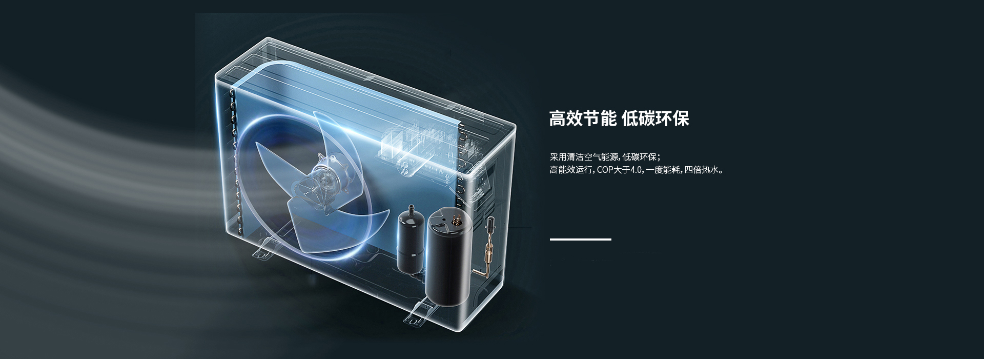 采用清潔空氣能源,低碳環保; 高能效運行,COP大于4.0,一度能耗,四倍熱水